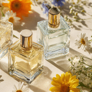 Prodotti naturali per la cura della persona, come sapone artigianale, crema e argilla in contenitori, accanto a un bouquet di lavanda su un tavolo di legno.